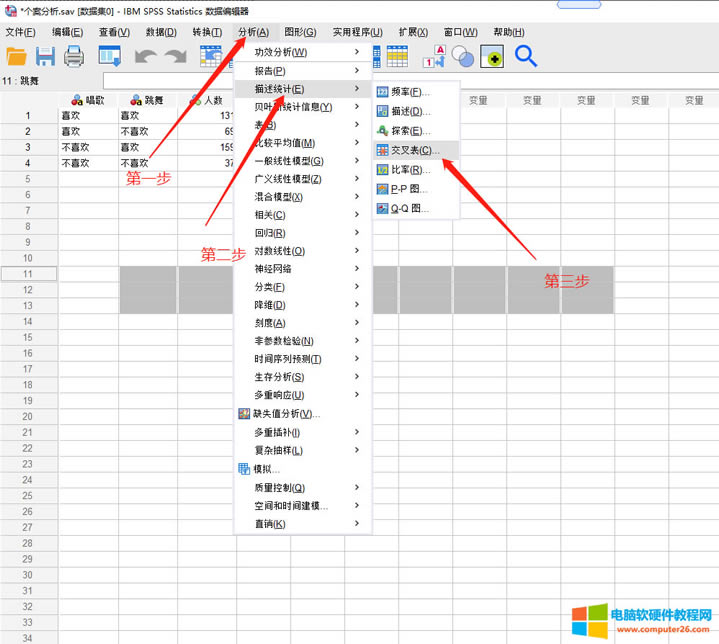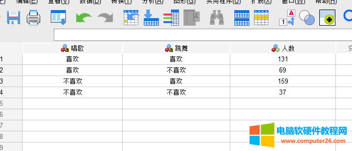 SPSS由IBM公司出品,它提供了包括描述性統計、推斷性統計、因子分析、聚類分析、回歸分析等多種統計分析功能,并包括文本分析、機器學習算法、數據分析模型等。SPSS的界面友好,易于操作,能夠快速從數據中提取有用的洞察和分析,廣泛應用于教育、心理、醫學、市場、人口、保險等多個研究領域,也用于產品質量控制、人事檔案管理和日常統計報表等。 大家第一次聽到個案加權的時候可能在想好高大上。其實個案加權是IBM SPSS Statistics中對頻數變量賦以權重的功能。用白話說就是將各個變量的關系用最直觀的方式呈現給別人。 以圖中的案例為原型我們進行個案加權,圖中的案例主要是在探究喜歡唱歌和喜歡跳舞這兩者之間是否存在聯系,我們選取了大量的數據樣本進行分析。 1、將要分析的數據導入