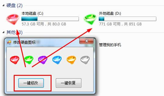 修改硬盤圖標是一款簡單易用的硬盤圖標修改器,可以幫助你一鍵修改硬盤圖標,讓你的硬盤圖標煥然一新。軟件很小,只有340K,純凈無毒、無插件。僅支持ico格式圖標。網上很多ico格式的圖標,自己搜索一下!