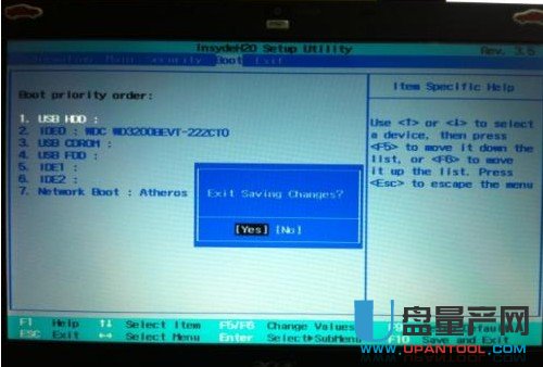 ![]() 6、按下F10,選擇“Yes”退出。 7、然后重啟電腦,在按下F12,在主界面中選擇U盤所在項。如下圖: