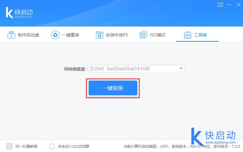 ![]() 2、選擇需要進(jìn)行格式轉(zhuǎn)換的磁盤,然后點(diǎn)擊“一鍵轉(zhuǎn)換”,隨后U盤啟動(dòng)盤制作工具便開始進(jìn)行格式轉(zhuǎn)換,如下圖所示: