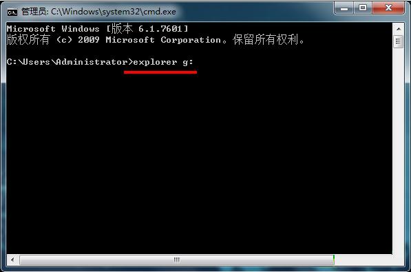 ![]() 2、在打開的管理員dos命令窗口中輸入“explore g:”命令(注意‘g’為當前u盤盤符),按回車鍵執行,如下圖所示: