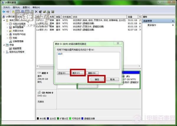 3、在彈出的窗口中,我們點擊“更改”,把該盤改成其他盤,點擊確定后。再改回來,這樣圖標就可以恢復原樣了。
