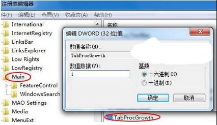 3、在右側(cè)窗格中找到TabProcGrowth鍵值。如果查不到TabProcGrowth鍵值,則在右側(cè)窗格空白處右鍵新建“DWord 32位”值,并將它重命名為TabProcGrowth,數(shù)值數(shù)據(jù)處輸入0或是1。賦值為1表示當(dāng)前系統(tǒng)最多允許IE8只能出現(xiàn)兩個(gè)進(jìn)程;若是賦值為0,表示IE僅能有一個(gè)進(jìn)程。