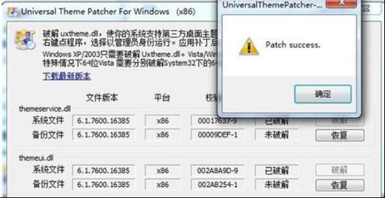 Windows 7,中文名稱視窗7,是由微軟公司(Microsoft)開發的操作系統,內核版本號為Windows NT 6.1。Windows 7可供家庭及商業工作環境:筆記本電腦 、平板電腦 、多媒體中心等使用。Windows 7可供選擇的版本有:入門版(Starter)、家庭普通版(Home Basic)、家庭高級版(Home Premium)、專業版(Professional)、企業版(Enterprise)(非零售)、旗艦版(Ultimate)。 ?今天筆者介紹Universal Theme Patcher破解大地win7主題的操作步驟。一些用戶很想去改一下WIN7里面的主題,但卻不知如何破解Windows7主題,其實Universal Theme Patcher軟件(Windows主題破解通用補丁),使破解win7主題很簡單,感興趣的用戶趕快來看看破解win7主題的詳細步驟吧。1.下載軟件Universal Theme Patcher 解壓縮后如圖,根據你的操作系統類型,選擇x86(32位)或x64(64位)版軟件,雙擊運行 2.軟件會提醒你,你的操作系統版本,你需要破解多少個文件。 ![]() 3.軟件主界面,自動檢測哪個文件沒有被破解。分別點擊最右面的“破解”,會提示你破解成功。 ![]() 4.全部破解完成后,會提示你重啟生效。重啟后,你就可以自由自在享受各種漂亮的破解主題了。 ![]() windows 7 的設計主要圍繞五個重點——針對筆記本電腦的特有設計;基于應用服務的設計;用戶的個性化;視聽娛樂的優化;用戶易用性的新引擎。 跳躍列表,系統故障快速修復等,這些新功能令Windows 7成為最易用的Windows。 |