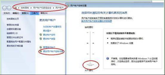依次點擊“開始——控制面板-——用戶賬號和家庭安全——用戶賬號——更改用戶賬戶控制設置——左側拉到最下面(從不通知)”,設置完成后,重啟計算機即可。