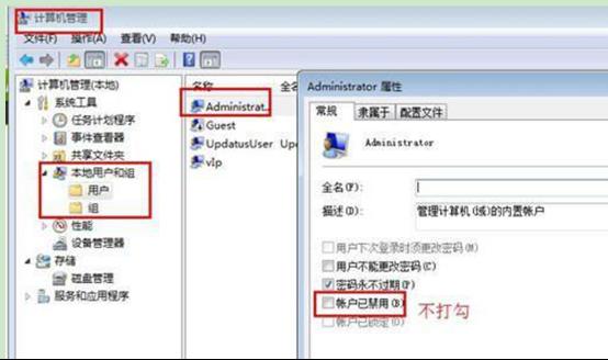 在我的電腦上右擊選擇“管理”,在打開的計算機管理界面中點擊“本地用戶組——用戶”,然后在右側列表中右擊administrator選擇屬性,在彈出的屬性窗口中,去掉“賬號已禁用”前面的勾選即可。