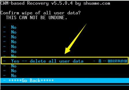 3、在打開的“消除數(shù)據(jù)/恢復(fù)出廠設(shè)置”窗口中,選擇“Yes,delete all user date”項,按“電源”鍵進入清除。