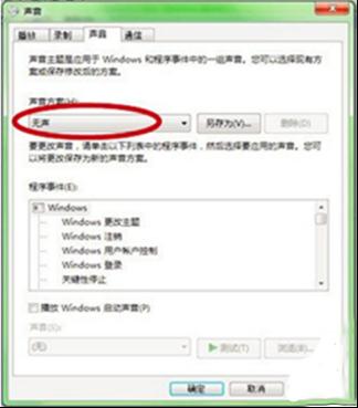 4、彈出“聲音”設(shè)置界面,在聲音標簽中,將聲音方案設(shè)定為“無聲”后,點擊“確定”保存即可。