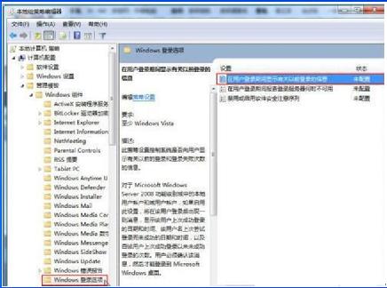 2、在Win7組策略設(shè)置窗口中,依次進入“計算機配置→管理模塊→Windows 組件→Windows 登錄選項”,點擊“在用戶登錄期間顯示有關(guān)登錄以前的信息”,
