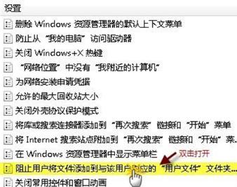 3、單擊“Windows 資源管理器”后,從右側窗口中找到‘阻止用戶將文件添加到與該用戶對應的“用戶文件夾”文件夾的根目錄下’,并雙擊打開。
