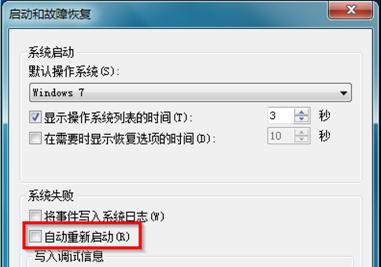 4、在出現(xiàn)的“啟動(dòng)和故障恢復(fù)”窗口,去掉“自動(dòng)重新啟動(dòng)”復(fù)選框前面的勾選,點(diǎn)擊“確定”即可。
