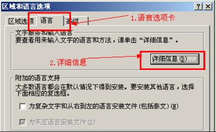 2、在打開的區(qū)域和語言選項(xiàng)窗口中,切換到“語言”標(biāo)簽頁,在語言標(biāo)簽頁中點(diǎn)擊“詳細(xì)信息”按扭。