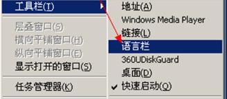 5、通過以上設(shè)置后,一般來說,桌面就會(huì)已經(jīng)有輸入法的圖標(biāo)了,如果不是在任務(wù)欄中,就是在桌面。如果找不到的話,請(qǐng)?jiān)谌蝿?wù)欄空白處右鍵,選擇“工具欄——語言欄”,這樣輸入法就會(huì)出現(xiàn)在桌面托盤左邊了。