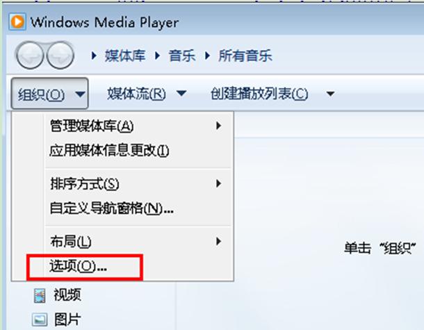 1、打開Windows Media Player 12,點擊菜單欄上方的“組織——選項”。