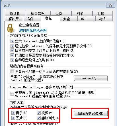 2、在打開的選項窗口中,切換到“隱私”標簽頁,在下方可以看到歷史記錄這一塊,將“音樂”、“圖片”、“視頻”、“播放列表”的勾選去掉,然后點擊“清除歷史記錄”按鈕,點擊確定按鈕退出即可。