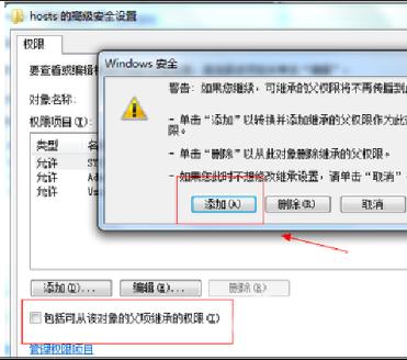 Windows 7,中文名稱視窗7,是由微軟公司(Microsoft)開發的操作系統,內核版本號為Windows NT 6.1。Windows 7可供家庭及商業工作環境:筆記本電腦 、平板電腦 、多媒體中心等使用。Windows 7可供選擇的版本有:入門版(Starter)、家庭普通版(Home Basic)、家庭高級版(Home Premium)、專業版(Professional)、企業版(Enterprise)(非零售)、旗艦版(Ultimate)。 在Win7系統修改完成Hosts文件后,進行保存的時候,卻出現了沒有權限修改的提示,也就是說無法保存,怎么辦?現小編給大家介紹系統之家精簡純凈win7系統hosts文件修改后無法保存的應對辦法,大家一起來學習下吧。![]() 1、打開以下路徑文件:c:\windows\system32\drivers\etc; 2、在該文件上右擊選擇“屬性”選項; 3、在打開的“hosts屬性”窗口中,切換到“安全”標簽頁,點擊“高級”按鈕; 4、在打開的窗口中,選擇“更改權限”按鈕; 5、在打開的“hosts的高級安全設置”窗口中,去除勾選“包括可從該對像的父項繼承的權限”,彈出“Windows 安全”窗口,單擊添加按鈕。 ![]() 6、在返回的窗口中點擊確定按鈕,在彈出windows安全窗口,單擊“是”按鈕; 7、再次點擊確定按鈕,回到“hosts屬性”窗口,選擇當前用戶所有的管理員組,點擊編輯按鈕; 8、在彈出的窗口中,勾選“當前用戶所在的管理組、給予完全控制的權限”即可。 以上就是系統之家精簡純凈win7系統hosts文件修改后無法保存的應對辦法介紹后,需要的用戶可以按照上面的步驟一步步的親自設置下。 windows 7 的設計主要圍繞五個重點——針對筆記本電腦的特有設計;基于應用服務的設計;用戶的個性化;視聽娛樂的優化;用戶易用性的新引擎。 跳躍列表,系統故障快速修復等,這些新功能令Windows 7成為最易用的Windows。 |