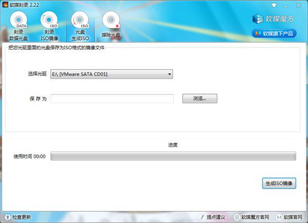 2、選擇“光盤生成ISO”選項卡,然后選擇插入了Win7系統(tǒng)光盤的光驅(一般都只有一個光驅,無需選擇),再選擇保存的位置。然后點擊“生成ISO鏡像”