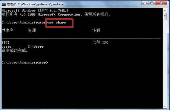 Windows 7,中文名稱視窗7,是由微軟公司(Microsoft)開發的操作系統,內核版本號為Windows NT 6.1。Windows 7可供家庭及商業工作環境:筆記本電腦 、平板電腦 、多媒體中心等使用。Windows 7可供選擇的版本有:入門版(Starter)、家庭普通版(Home Basic)、家庭高級版(Home Premium)、專業版(Professional)、企業版(Enterprise)(非零售)、旗艦版(Ultimate)。 使用Windows系統過程中,如果用戶對于dos命令熟悉的話,可快速實現很多操作,比如Net share命令主要用于共享資源的管理、添加。刪除以及查看局域網中的共享資源等。現小編給大家分享命令提示符窗口中快速查看雨林木風Win7系統本地計算機共享資源的方法,感興趣的用戶請來看看吧。具體操作步驟如下:1、按“WIN+R”組合鍵,打開運行窗口,輸入“CMD”命令,打開命令提示符界面。 ![]() 2、在命令提示符界面中,輸入“net share命令后按回車鍵。即可查看本地計算機共享資源了。 ![]() 以上簡單二步驟,就可快速查看本地計算機的共享資源了。通過以上分享后,希望對大家有所幫助。 windows 7 的設計主要圍繞五個重點——針對筆記本電腦的特有設計;基于應用服務的設計;用戶的個性化;視聽娛樂的優化;用戶易用性的新引擎。 跳躍列表,系統故障快速修復等,這些新功能令Windows 7成為最易用的Windows。 |
