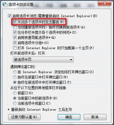 Windows 7,中文名稱視窗7,是由微軟公司(Microsoft)開發的操作系統,內核版本號為Windows NT 6.1。Windows 7可供家庭及商業工作環境:筆記本電腦 、平板電腦 、多媒體中心等使用。Windows 7可供選擇的版本有:入門版(Starter)、家庭普通版(Home Basic)、家庭高級版(Home Premium)、專業版(Professional)、企業版(Enterprise)(非零售)、旗艦版(Ultimate)。 在使用Win7系統使用IE8過程中,開啟關閉多個選項卡時發出警告,怎樣將此警告關閉掉呢?遇到此問題的請來看看技術員聯盟Windows7系統IE8選項卡發出警告的關閉方法吧,具體如下:1、打開IE8瀏覽器,點擊“工具―Internet選項”。 2、在打開的“Internet選項”窗口中,在常規標簽頁中,點擊選項卡欄右側的設置。 ![]() 3、彈出選項卡瀏覽設置窗口,將“關閉多個選項卡時發出的警告”前面的對勾去掉,點擊確定保存。 ![]() 4、此時系統會彈出警告,勾選“總是關閉所有選項卡”前面的勾,這樣就關閉掉了多個選項卡的警告。 ![]() windows 7 的設計主要圍繞五個重點——針對筆記本電腦的特有設計;基于應用服務的設計;用戶的個性化;視聽娛樂的優化;用戶易用性的新引擎。 跳躍列表,系統故障快速修復等,這些新功能令Windows 7成為最易用的Windows。 |