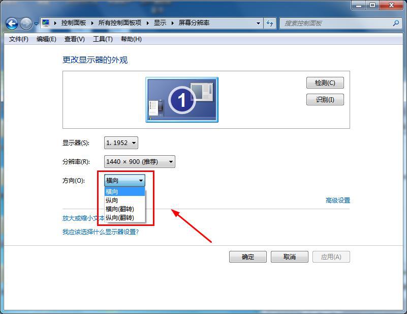 2、在顯示窗口中,調(diào)整分辨率中方向一欄里有“橫向”、“縱向”、“橫向翻轉(zhuǎn)”、“縱向翻轉(zhuǎn)”幾個(gè)選項(xiàng)。將這個(gè)選項(xiàng)修改為“橫向”選項(xiàng)即可。“橫向”選項(xiàng)也就是正常選項(xiàng)也是默認(rèn)選項(xiàng)。