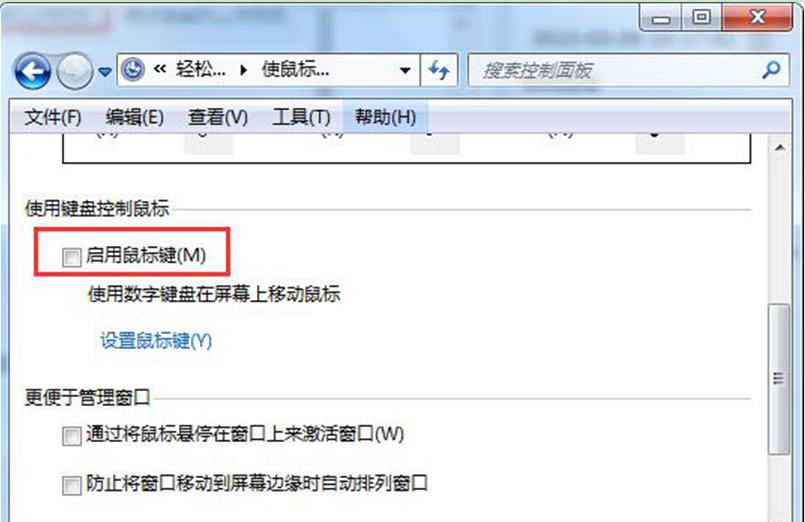 2、點(diǎn)擊“更改鼠標(biāo)的工作方式”選項(xiàng),將“啟用鼠標(biāo)鍵”前面的勾選去掉,最后點(diǎn)擊應(yīng)用即可解決以上問題了。