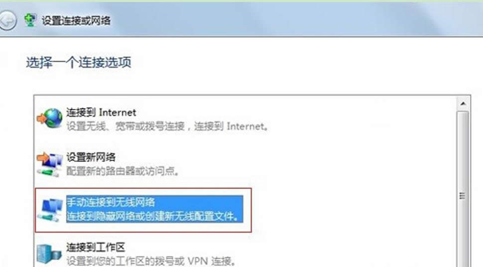 3、選擇“手動(dòng)連接到無(wú)線網(wǎng)絡(luò)”的選項(xiàng)。
