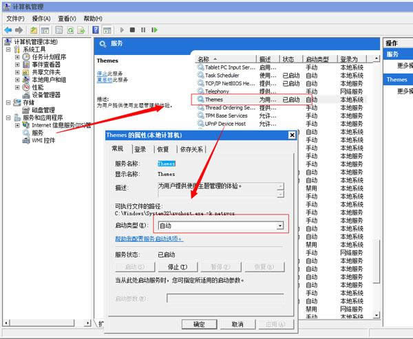 2、在打開的計算機管理窗口中,點擊“服務與應用程序——服務——Themes服務”,改成自動即可。