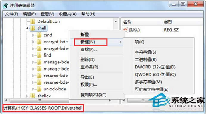 2、在打開的注冊表編輯器窗口中,在左側(cè)窗口依次點(diǎn)擊展開以下注冊項(xiàng)HKEY_CLASSES_ROOT\Drive\shell,