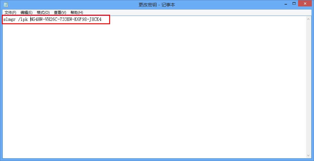 2.打開文本文檔輸入“slmgr /ipk NG4HW-VH26C-733KW-K6F98-J8CK4”