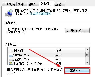 第三步,在彈出來的系統(tǒng)屬性窗口中,我們找到這個配置選項,并點擊進(jìn)入。如果你的系統(tǒng)以前有設(shè)置過還原點,那么這里就可以進(jìn)去后選擇配置好的還原點進(jìn)行還原,如果沒有的話,我們這里就選擇配置下方的創(chuàng)建操作。