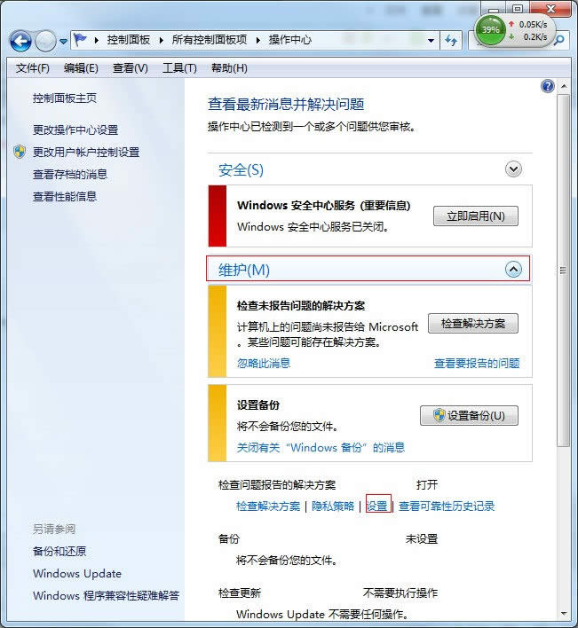 第二,點擊“操作中心”左上角的“更改操作中心設置”,點擊“維護”。