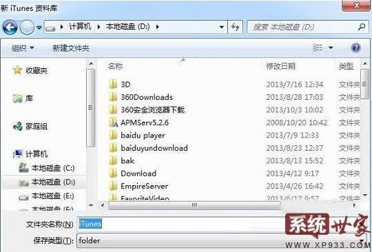 2、接著在彈出來的窗口中,點擊“創建資料庫”,就會彈出一個新iTunes資料庫創建窗口,選擇你要創建的地方,比如D盤,文件夾名稱命名為“iTunes”,保存類型為“folder”,然后點擊保存;