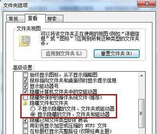 2.在文件夾選項(xiàng)窗口中切換“查看”選項(xiàng)卡,在高級(jí)設(shè)置一欄將“隱藏受保護(hù)的操作系統(tǒng)文件”前面的勾選去掉,然后再選中“顯示隱藏的文件、文件夾和驅(qū)動(dòng)器”復(fù)選框,點(diǎn)擊“確定”。