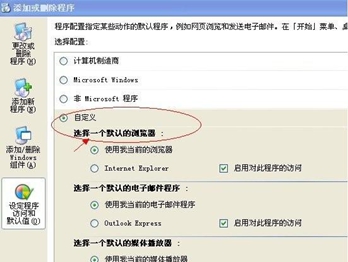 一、打開桌面,在開始菜單中找到 “控制面板” ,找到 “添加或刪除程序” 最后選擇 “設(shè)定程序訪問默認(rèn)值” ,最后選擇自定義,如下圖: