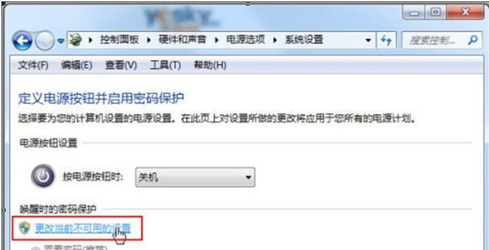 2、然后系統(tǒng)進(jìn)入控制面板-硬件與聲音-電源選項(xiàng)-系統(tǒng)設(shè)置面板中,點(diǎn)擊“更改當(dāng)前不可用的設(shè)置”。