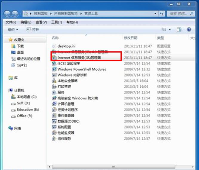 3、安裝完成后,打開(kāi)控制面板,進(jìn)入管理工具,點(diǎn)Internet信息服務(wù)(IIS)管理器。