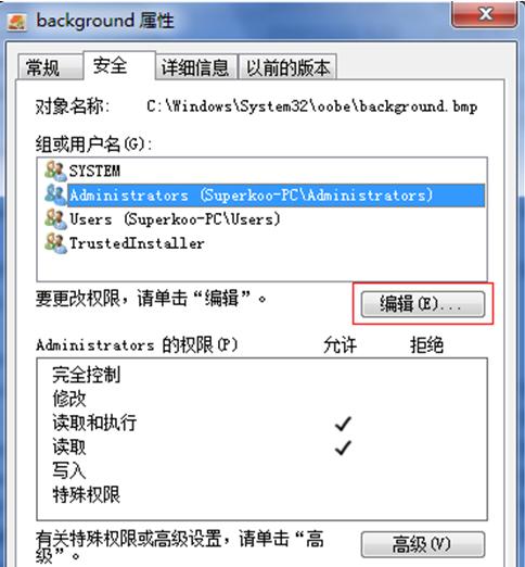 3、獲得文件所有者權(quán)限后,便可對文件賦予相應(yīng)的控制權(quán)限了(此處設(shè)置Adminitrators為完全控制權(quán)限)。重新打開文件安全屬性,點擊編輯。