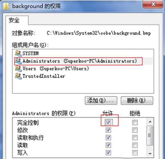 4、對Adminitrators的權(quán)限勾選完全控制,確定即可。