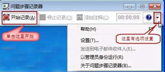 2.在 “問題步驟記錄器”中點(diǎn)擊右上角“三角”,在下拉條中選擇“設(shè)置”,選擇“問題步驟記錄”的輸出路徑后點(diǎn)擊“開始記錄”。