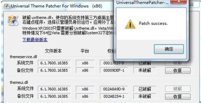 Windows 7,中文名稱視窗7,是由微軟公司(Microsoft)開發的操作系統,內核版本號為Windows NT 6.1。Windows 7可供家庭及商業工作環境:筆記本電腦 、平板電腦 、多媒體中心等使用。Windows 7可供選擇的版本有:入門版(Starter)、家庭普通版(Home Basic)、家庭高級版(Home Premium)、專業版(Professional)、企業版(Enterprise)(非零售)、旗艦版(Ultimate)。 ?Win7系統使用過程中,有些用戶為了追求美觀,經常會更換一些不同的主題,甚至有些用戶還想去改一下WIN7里面的主題,破解Windows7主題,Win7系統之家給推薦大家使用Universal Theme Patcher (Windows主題破解通用補丁),這樣使用起來比較簡單,現給大家詳解電腦公司Win7純凈版系統中破解win7主題的步驟。具體如下:1.下載軟件解Universal Theme Patcher 壓縮后如圖,根據你的操作系統類型,選擇x86(32位)或x64(64位)版軟件,雙擊運行 ![]() 2.軟件會提醒你,你的操作系統版本,你需要破解多少個文件。 ![]() 3.軟件主界面,自動檢測哪個文件沒有被破解。分別點擊最右面的“破解”,會提示你破解成功。 ![]() 4.全部破解完成后,會提示你重啟生效。重啟后,你就可以自由自在享受各種漂亮的破解主題了。 ![]() windows 7 的設計主要圍繞五個重點——針對筆記本電腦的特有設計;基于應用服務的設計;用戶的個性化;視聽娛樂的優化;用戶易用性的新引擎。 跳躍列表,系統故障快速修復等,這些新功能令Windows 7成為最易用的Windows。 |