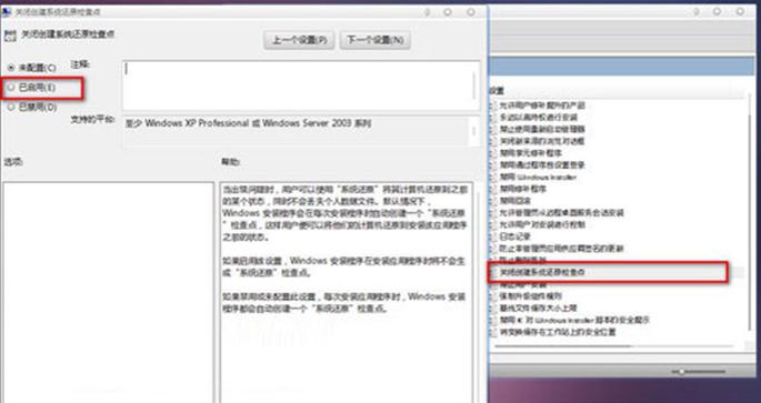 再次展開(kāi)“計(jì)算機(jī)配置→管理模板→Windows組件→Windows Installer”,在右邊雙擊“關(guān)閉創(chuàng)建系統(tǒng)還原檢查點(diǎn)”,設(shè)為“啟用”。