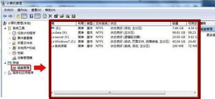 1、右擊 “計(jì)算機(jī)”,選擇 “ 管理”。彈出“計(jì)算機(jī)管理”窗口左側(cè)選擇“磁盤(pán)管理” ,就會(huì)出現(xiàn)中間的界面。
