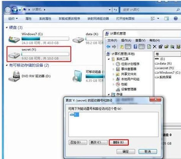 4、選擇 “是” 以后,原本Y盤(pán)的驅(qū)動(dòng)器號(hào)已經(jīng)沒(méi)有了,只剩下卷標(biāo)“ secret ”,此時(shí)在“計(jì)算機(jī)”文件夾下已看不到Y(jié)盤(pán)了。這樣就算是徹底藏起來(lái)了。