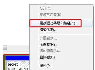 5、當(dāng)我們需要恢復(fù)的時(shí)候,再次右鍵單擊“計(jì)算機(jī)管理”下、磁盤(pán)0右側(cè)的“ secret ”這個(gè)盤(pán)符,選擇 “ 更改驅(qū)動(dòng)器號(hào)和路徑 ”。