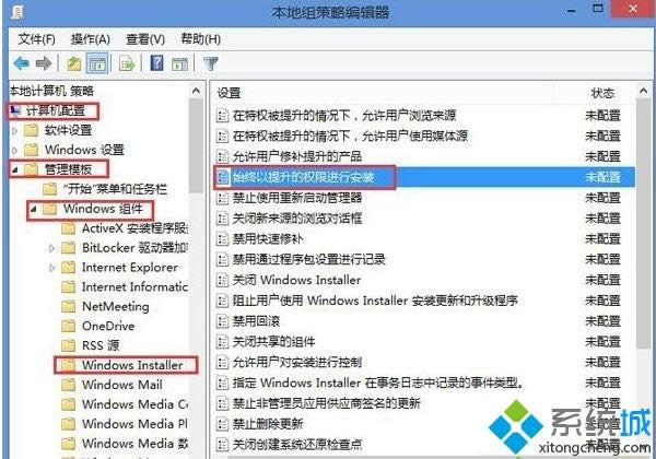 2、打開本地策略組編輯器后,在左側(cè)依次展開“計算機配置--管理模板--windows組件--windows installer”,在右側(cè)找到“始終以提升的權(quán)限進行安裝”策略并雙擊打開。