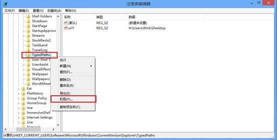 搜到之后,右鍵單擊“TypedPaths”選擇“權限”,在權限對話框中選擇當前的用戶,在下面的設置中把勾打上,然后點擊“確定”,如圖