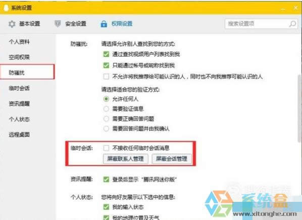 5、最后再“防騷擾”項右側找到“臨時會話”,然后將“不接收任何臨時會話消息”勾選。