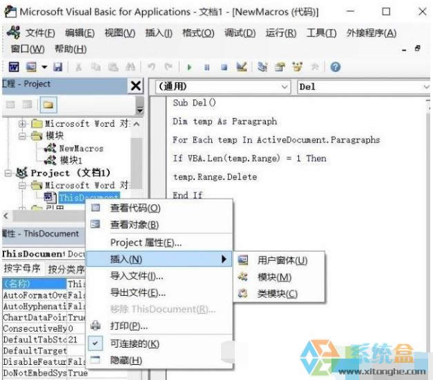 2、這時會彈出一個名為Microsoft Visual Basic for Applications的代碼界面,在下方文件欄中找到“Project(文檔1)—Microsoft Word對象”并鼠標右鍵單擊這個選項,彈出菜單后選擇“插入”中的“模塊”。