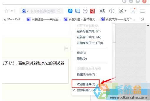 2、我們可以在任意一個我們收藏的網站上鼠標右鍵單擊,這時在彈出的菜單中選擇“收藏管理器”。