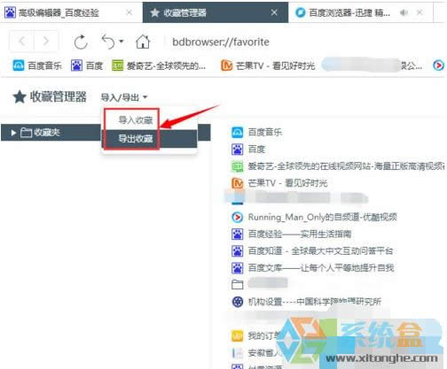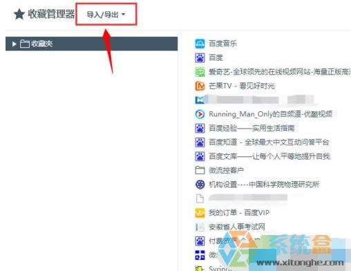 3、進入收藏管理器后,我們就能看到一個百度瀏覽器的收藏夾界面,在界面左上角能看到“導入/導出”選項,單擊該選項。